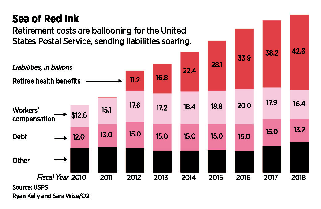 USPS’s total unfunded liabilities and debt were $143 billion at the end of the fiscal year 2018, an amount double its annual revenue.