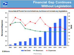 Declining revenues in the amount of physical mail sent and increased pension payouts make it nearly impossible that this debt to taxpayers will be repaid. As a result, efforts are underway to completely transfer this $100 billion in retirement costs to the backs of taxpayers.