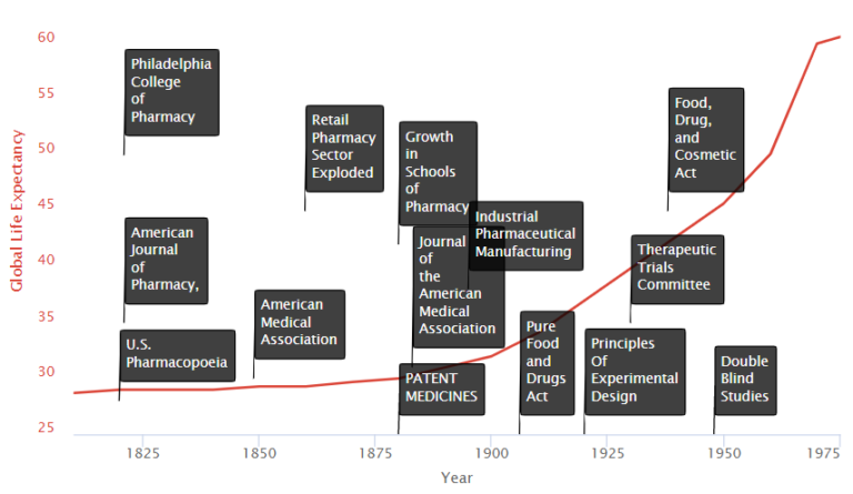 An influx of new state-affiliated pharmacy schools in the 1880s and 1890s. The growth in schools of medicine trained physicians and researchers in the systematic collection of clinical data on the safety and efficacy of treatments. They also served as hubs where scientists could share new medical discoveries.