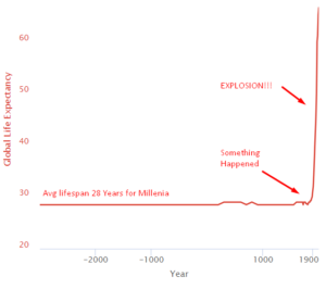 For 50 years before 1962, life expectancy grew by 4 years per decade. A perfectly linear growth rate that had followed millennia of zero growth.