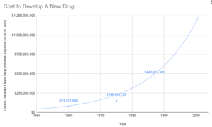 Since 1962, the cost of bringing a new treatment to market went from $74 million to over $1 billion (2020 inflation-adjusted).