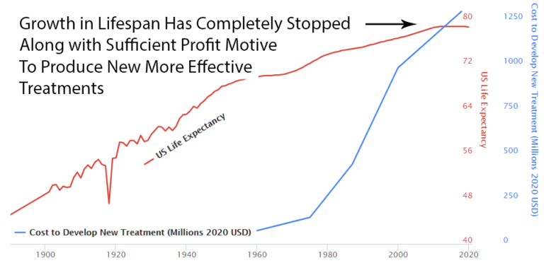 The current flat line in US lifespan growth and chronic disease burden is completely consistent with a system that completely disincentivizes medical progress.