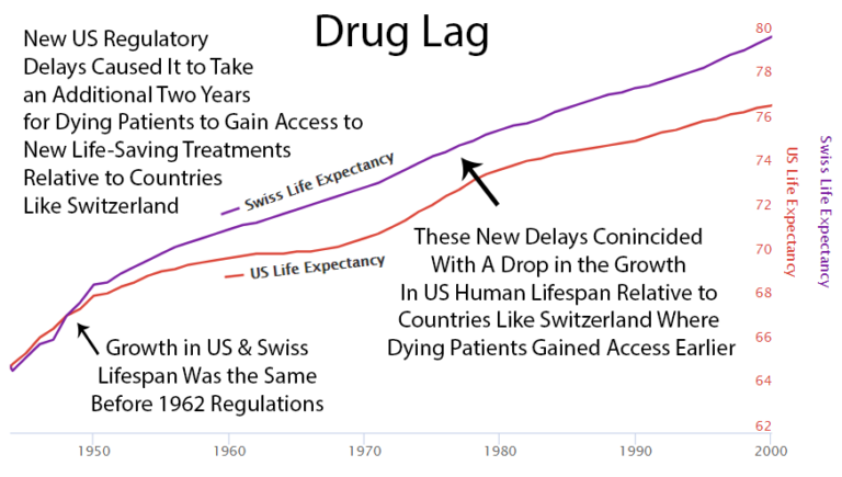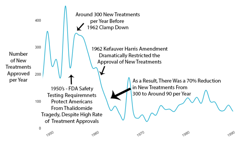 Safety regulations were already working. So the government added massive new efficacy testing requirements via the 1962 Kefauver Harris Amendment. If it's not broken, add 10 years and $1 billion to the process. This is what you call "improvement" even though everything got worse.