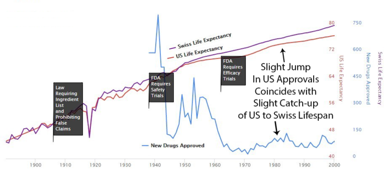 After the 1962 U.S. regulations, life expectancy in the U.S. diverged from Switzerland, which didn't add the same delays.