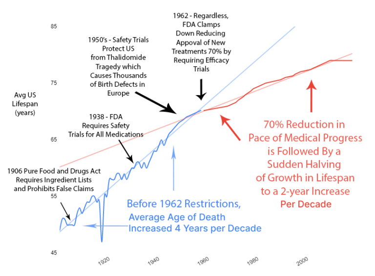 After the 1962 regulations cut medical progress by 70%, life expectancy growth was immediately cut in half. From 4 years per decade to 2 years per decade.